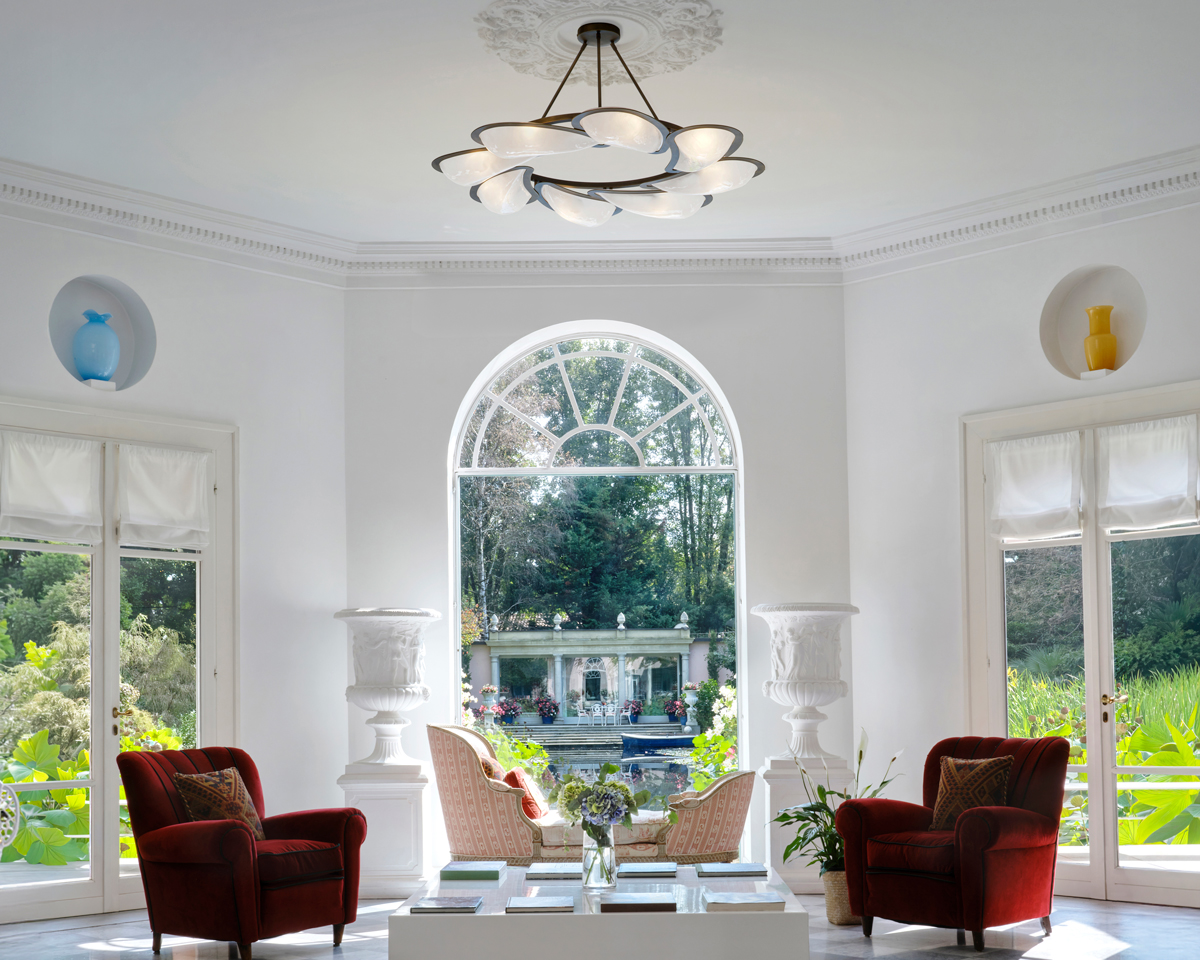To the left: a custom 12-foot Geometria ceiling light suspended in a Connecticut home designed by Jeff Lincoln Interiors